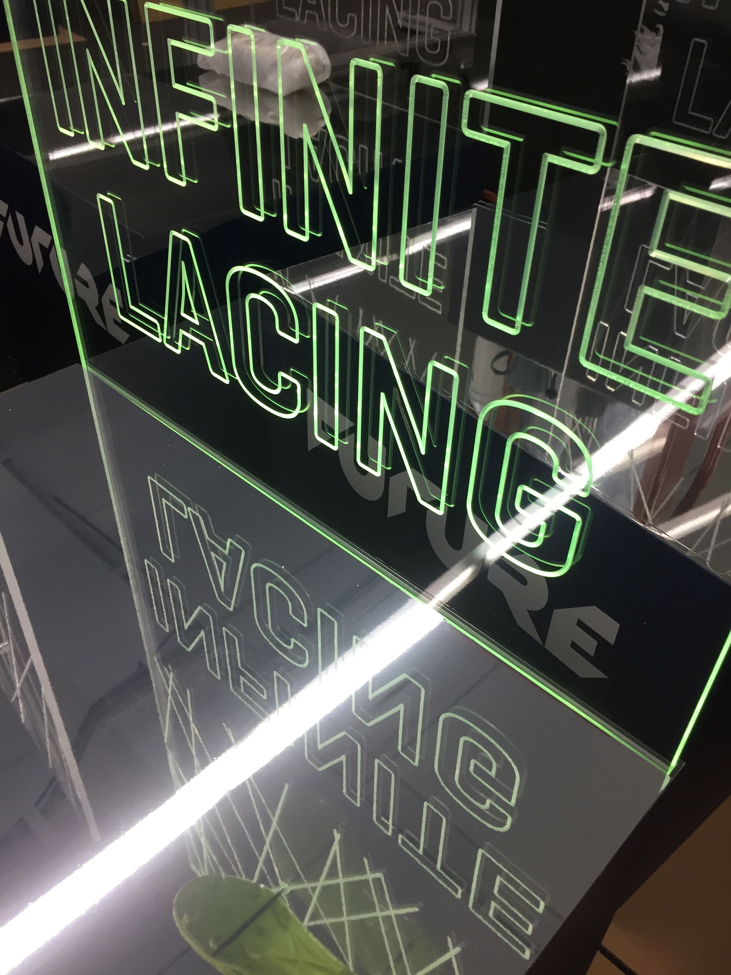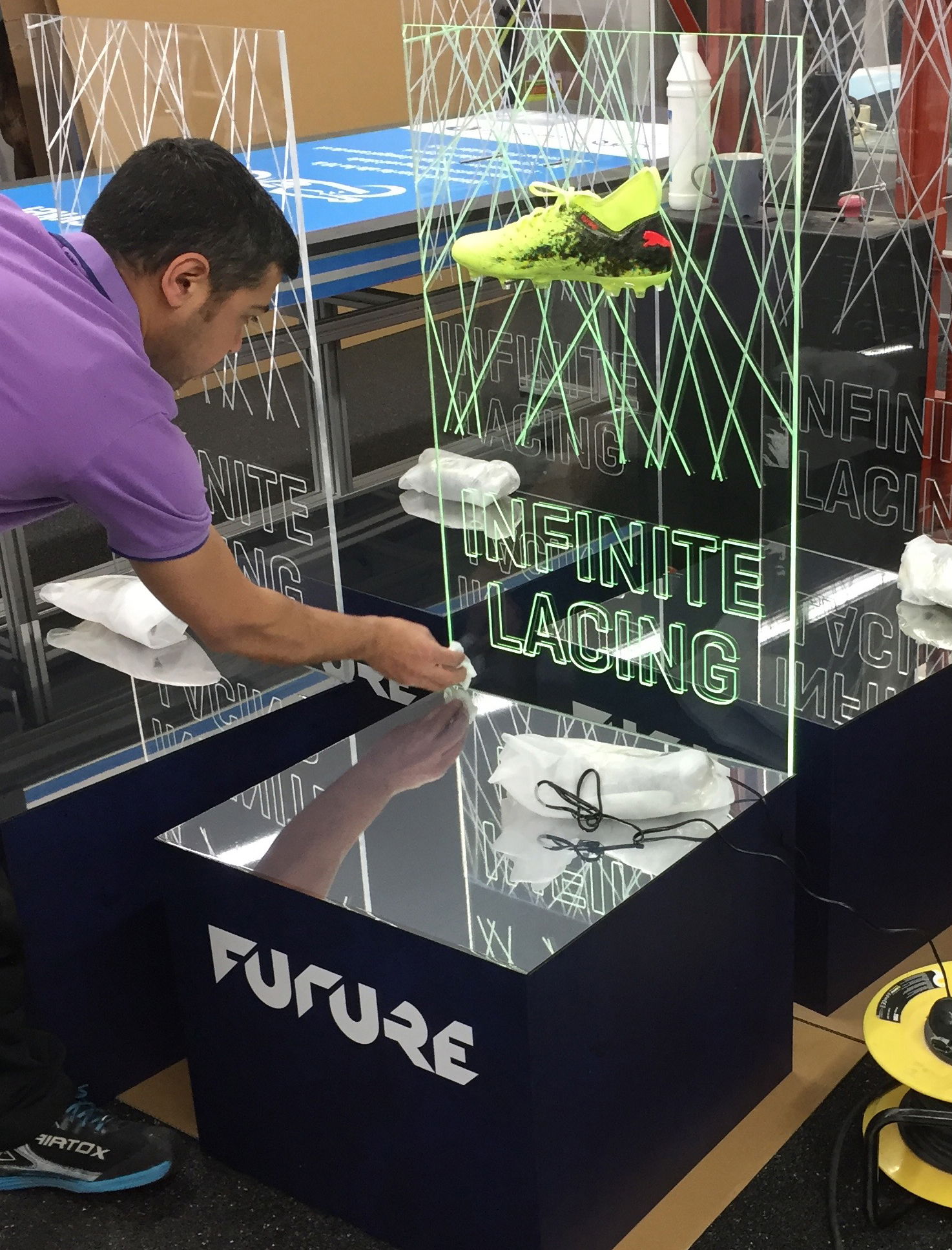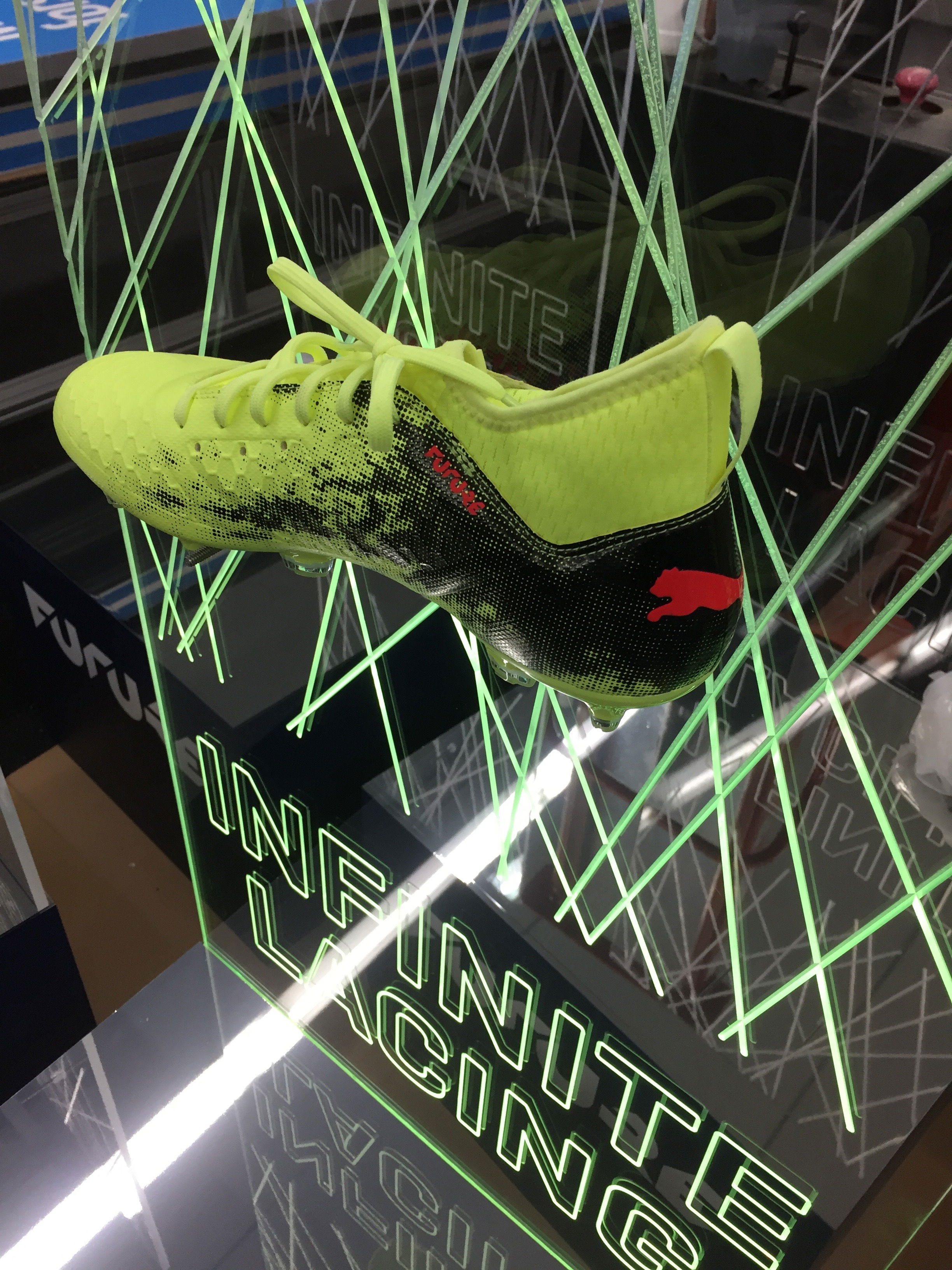 För presentationen av Pumas nya fotbollssko önskade sportvarumärket ett fristående display med en upplyst grön kant som elegant ramade in skon.
