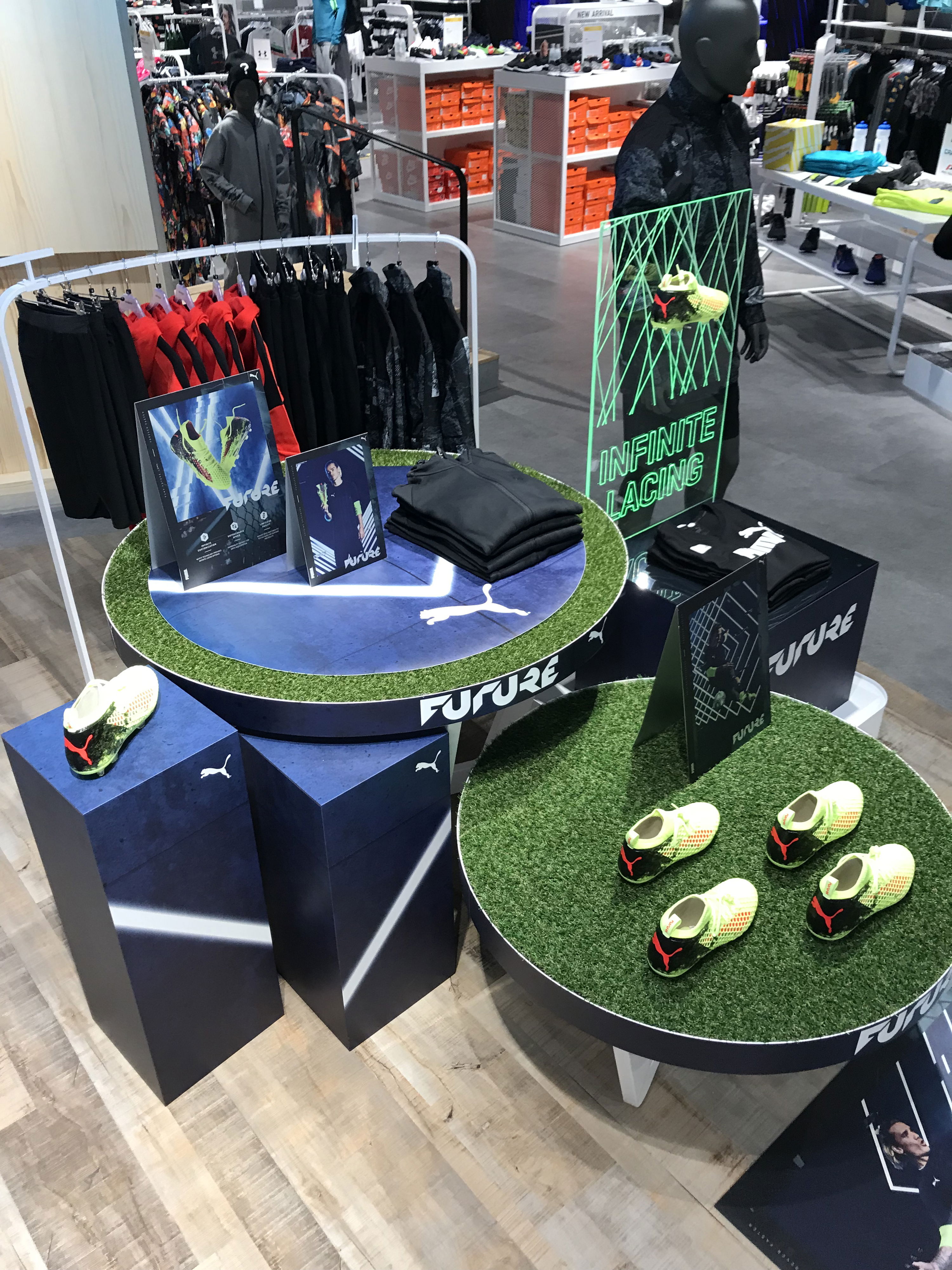 För presentationen av Pumas nya fotbollssko utvecklade och producerade vi en uppställning med podier i olika höjder. Puma önskade ett futuristiskt uttryck som matchade skons namn, Future. Ett av podierna utrustades därför med en akrylskiva som belystes underifrån med grönt LED-ljus.